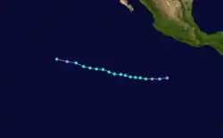 An area of disturbed weather was observed south of Guatemala on July 14.[4] It developed into a tropical depression around 06:00 UTC on July 17 and became Tropical Storm Dolores twelve hours later.[7] Moving along the south side of an upper-level area of high pressure, the cyclone passed over warm waters which facilitated its continued development.[4] It became a hurricane at 18:00 UTC on July 18 and then entered a period of rapid intensification, which coincided with the formation of a well-defined eye on satellite imagery.[4] Dolores strengthened into the season's first major hurricane around 06:00 UTC on July 20 and, after a brief fluctuation in intensity, attained peak winds of 120 mph (190 km/h) early on July 21.[7] High pressure shifted northeast into northern Mexico, causing Dolores to curve northwest into cooler waters and drier air. The system dissipated well to the west of Baja California after 18:00 UTC on July 23.[4]