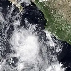 A tropical disturbance formed in the Gulf of Tehuantepec on July 11 and developed into a tropical depression around 18:00 UTC on July 14. The cyclone moved swiftly westward, becoming Tropical Storm Carlos within six hours and reaching peak winds of 50 mph (80 km/h) on July 15. Carlos passed about 20 miles (32 km) south of Socorro Island, soon crossing into cooler waters and drier air. The cyclone dissipated southwest of Baja California Sur after 06:00 UTC on July 16.[4]