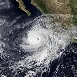 Over two weeks after the dissipation of Hilda, a new tropical disturbance formed southwest of Guatemala on October 22. It tracked steadily westward, becoming a tropical depression around 18:00 UTC on October 23 and Tropical Storm Ignacio at 12:00 UTC the next day. A curve toward the northwest brought the cyclone over progressively warmer waters,[4] and it reached hurricane intensity around 18:00 UTC on October 26. Ignacio soon thereafter began a period of rapid intensification, vaulting from Category 2 to Category 4 intensity within six hours.[7] A United States Air Force reconnaissance plane investigated the powerful storm at 18:00 UTC on October 27, finding peak winds of 145 mph (233 km/h) – tied with Enrique as the strongest of the season – as well as a 25-mile (35-km) diameter eye covered only by broken low-level clouds.