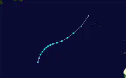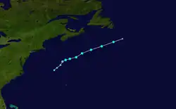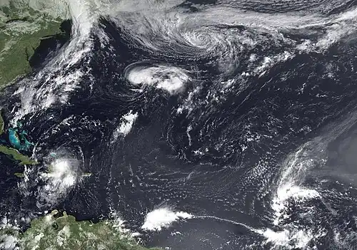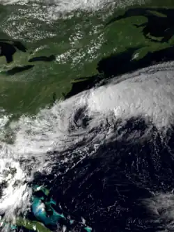 The thirteenth operationally classified tropical depression developed 275 mi (445 km) southwest of Bermuda on September 23,[52] and was initially expected to intensify into a tropical storm.[53] Although it failed to further intensify, Tropical Depression Thirteen brought squalls to Bermuda with winds gusts of tropical storm-force as it passed west of the island later that day. Moving northward, the system merged with a developing extratropical cyclone south of Nova Scotia on September 24.[18]