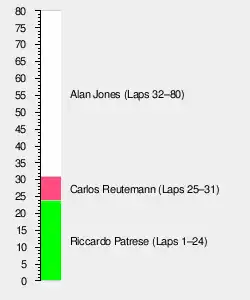 Patrese's retirement left Reutemann with a three-second lead over teammate Jones, who immediately began closing the gap by half a second per lap. Any questions about team orders letting the number one driver through were soon answered. On lap 32, while lapping Marc Surer's Ensign, Reutemann slid wide in the esses on Pine Avenue, and Jones went through for the lead. Within 12 laps, the defending World Champion had stretched out a lead of ten seconds. At the same time, Reutemann was extending his lead over Piquet to 36 seconds.