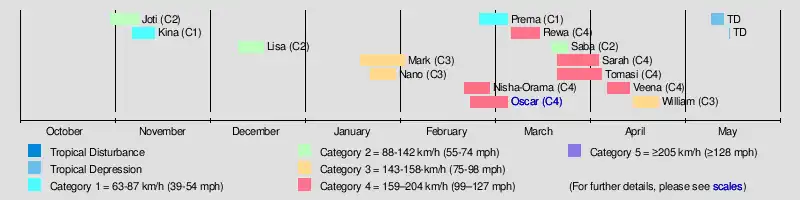 | Oscar | February 23 – March 6 | Category 4 severe tropical cyclone | 185 km/h (115 mph) | 920 hPa (27.17 inHg) | Fiji | $130 million | 9 | [16] |