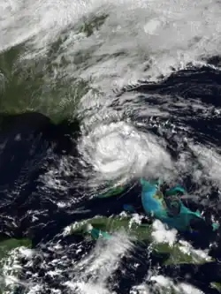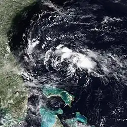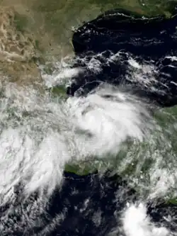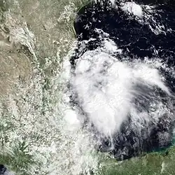The origins of Tropical Storm Edouard are unclear, but an area of persistent organized storms formed in the Bay of Campeche, which strengthened into a tropical storm on September 14. Edouard rapidly intensified, with wind speeds reaching 65 miles per hour (105 km/h) in 18 hours as a faint eye feature became visible. Following its strengthening, Edouard dissipated even more quickly, degenerating into an area of thunderstorms the next day.[36] The remnants of Edouard moved over land near the port of Veracruz.[37]
