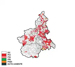 In the Regional Council of Piedmont, Christian Democracy resulted narrowly ahead of the Italian Communist Party, which had been ousted from the regional government by the Italian Socialist Party in 1983. After the election, the Socialists and Christian Democrats, along with the Italian Republican Party, the Italian Liberal Party, and the Italian Democratic Socialist Party, continued their Pentapartito alliance but this time the regional government was led by a Christian Democrat, Vittorio Beltrami.