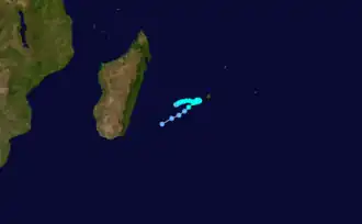 While Bemezava was still active, another circulation was present between Réunion and Madagascar on February 8. On the next day, a tropical disturbance formed about 150 km (95 mi) east-southeast of Toamasina, Madagascar. A ridge to the south caused the nascent system to move erratic, although generally to the southeast and east. It intensified into Tropical Storm Clotilda on February 10,[16][17] and on the next day that the JTWC classified it as Tropical Cyclone 17S.[2] The storm slowed and approached within 50 km (30 mi) of Réunion before stalling. It moved slowly near the island for two days, during which it remained about 30 km (18 mi) off the northern coast. On February 13, Clotilda attained peak 10 minute winds of 110 km/h (70 mph). A weak ridge steered the storm back to the southwest, and on February 14, Clotilda struck northern Réunion at Sainte-Suzanne. The ridge moved to the east, causing the storm to accelerate and gradually weaken. On February 17, Clotilda became extratropical while turning southeastward due to an approaching trough. The remnants persisted several days until dissipating on February 22 near Île Amsterdam.[16][17]
