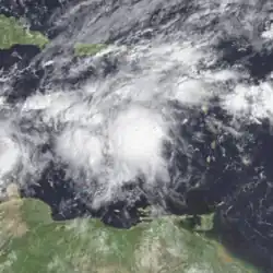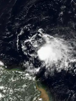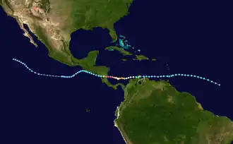 Tropical Depression Six developed from a tropical wave that moved off the northwest African coast on August 12. The system crossed the tropical Atlantic as a wave until it began organizing near 55° W on August 19.[30] The next day this system was designated a tropical depression while it approached the Windward Islands. After crossing the islands, the depression continued westward into the central Caribbean and encountered less-favorable conditions.[31] Though poorly organized on August 21, the depression was expected to strengthen into a tropical storm over the western Caribbean's warmer waters. Nevertheless, it was downgraded to a tropical wave at 80° W near the island of Jamaica on August 23.[32] The disturbance moved over Central America with minimal convection but redeveloped into Hurricane Kristy once it reached the eastern Pacific.[30] The system's main effect on land was squally weather on the Windward Islands.[5]
