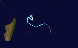 Operationally, the MFR considered the tropical cyclone year to begin on August 1 and continue to July 31 of the following year.[1] However, the JTWC began the year on July 1 and it lasted through June 30 of the following year.[2] The latter agency tracked two short-lived tropical cyclones in July 1989, labeling them Tropical Cyclone 01S and 02S, but they are not considered part of MFR's season.[2] After these early storms, another tropical depression formed east of Diego Garcia on September 21, classified as Tropical Cyclone 03S.[4] Forming from the near-equatorial trough,[5] the system moved generally to the southwest, dissipating on September 27 as it approached Mauritius.[4] In the next month, Tropical Cyclone 04S formed closer to Diego Garcia on October 11. The JTWC classified it as a tropical depression on October 13 but dropped advisories the next day. The system initially drifted to the south but later turned to the northwest, dissipating on October 17.[2][6] The final of a series of early tropical systems was a tropical depression that formed east of Diego Garcia on October 28. It moved southeastward, classified by the JTWC as Tropical Cyclone 05S on October 31. The agency briefly estimated peak winds of 65 km/h (40 mph), making it a tropical storm, before the storm looped back to the west and dissipated on November 2.[2][7] Later, the precursor to Australian Tropical Cyclone Bessi was tracked in the eastern portion of the south-west Indian Ocean basin in the middle of April. The Australian Bureau of Meteorology (BOM) classified the system as a minimal tropical storm while still west of 90° E, although the MFR did not classify the system before it entered the Australian basin on April 15.[8]