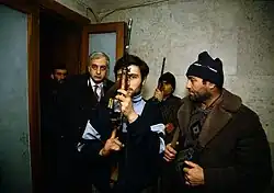 In January 1991, Zviad Gamsakhurdia signed an executive decree creating the National Guard of Georgia, a prelude to the future Georgian Army, under the jurisdiction of the new Ministry of Internal Affairs.[15] At its head, he appointed Tengiz Kitovani, recently elected to the Supreme Council of Georgia with Gamsakhurdia's party, with a mission to recruit 20,000 capable soldiers.[15] Meanwhile, the government attempted to reign in the various paramilitary organizations which had recently emerged in the country and were utilized by the political forces.[16] In February, the Ministry of Internal Affairs, while attempting to shut down the several paramilitary organizations, arrested ten members of the opposition National Democratic Party (NDP) and 56 members of the opposition Mkhedrioni paramilitary, including its leader, Jaba Ioseliani, a former criminal-turned-theater critique, for illegal possession of the weapons in Kakheti.[17] [18][17]
