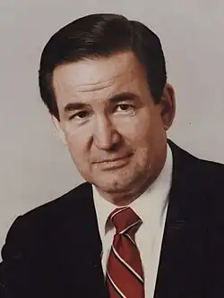 Paleoconservative journalist Pat Buchanan was the primary opponent of President Bush; Ron Paul, the Libertarian Party's presidential nominee in 1988, had planned to run against the President, but dropped out shortly after Buchanan's entry in December. Buchanan's best showing was in the New Hampshire primary on February 18, 1992—where Bush won by a 53–38% margin.[17] President Bush won 73% of all primary votes, with 9,199,463 votes. Buchanan won 2,899,488 votes; unpledged delegates won 287,383 votes, and David Duke, Grand Wizard of the Ku Klux Klan, won 119,115 votes. Just over 100,000 votes were cast for all other candidates, half of which were write-in votes for H. Ross Perot.[18] Former Minnesota governor Harold Stassen, who had run for president nine times since 1944, also mounted his final campaign.
