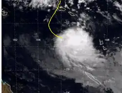 On 20 April, the JTWC started to monitor an area of low pressure that located over the Solomon Islands about 155 km (95 mi) to the north of Honiara.[12] During that day the disturbance moved towards the southeast and passed over several of the Solomon Islands, before emerging into the Australian basin.[12] Over the next couple of days the disturbance gradually developed further while moving towards the southwest before re-curving and moving southeastwards.[12] On 24 April, as it moved back into the South Pacific basin, the JTWC initiated advisories on the disturbance, designating it as Tropical Cyclone 29P, with peak windspeeds equivalent to a tropical depression.[12][13] As the system was classified, it recurved again and started to move slowly towards the northwest, and started to feel the effects of a high amount of vertical windshear.[12][13] As a result of the windshear, the center became exposed and displaced from the deep convection before the JTWC issued their final advisory on 25 April as 29P weakened into an area of low pressure, before dissipating later that day about 600 km (375 mi) to the southwest of Honiara.[12][13]
