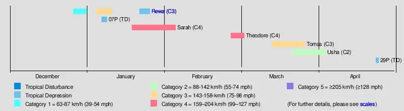| Rewa | December 26, 1993 – January 23, 1994 | Category 3 severe tropical cyclone | 150 km/h (90 mph) | 950 hPa (28.05 inHg) | Australia, New Caledonia New Zealand, Papua New Guinea Solomon Islands, Vanuatu |