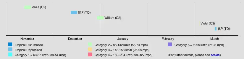 Vania November 12 – 18 Category 2 tropical cyclone 100 km/h (65 mph) 980 hPa (28.94 inHg) Solomon Islands, Vanuatu, New Caledonia, Fiji Unknown Unknown [4]