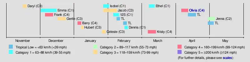 At the end of the season, the Bureau of Meteorology retired seven of the thirteen names used during the season. The names were Frank, Gertie, Kirsty, Barry, Celeste, Ethel and Olivia.[22] The replacement names were Floyd, Glenda, Kara, Bruce, Cecily, Edna and Olwyn. Floyd and Glenda were used in 2006, Kara in 2007, Bruce and Edna in the 2013–14 season and Olwyn in 2015. Cecily was not retained after the naming lists were combined prior to the 2008-09 cyclone season.