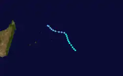 On February 16, Cyclone Victor crossed into the basin from the Australian Region with a well-defined circulation but little convection. Despite being downgraded to a tropical disturbance, the system was named Cindy by the Mauritius Meteorological Service on February 16. The system continued gradually weakening while turning more to the southwest, dissipating on February 19.[1] This marked the end of a 50‑day period in which the related storms Katrina and Victor-Cindy were active.[15]