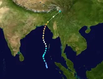 On May 13, a near-equatorial trough developed. The poorly organized system slowly tracked towards the north-northwest. The following day, deep convection consolidated around the center of circulation and the Joint Typhoon Warning Center (JTWC) classified the system as Tropical Cyclone 01B. Favorable upper-level conditions and good outflow allowed the storm to intensify. Shortly after, the cyclone attained tropical storm-force winds and turned towards the northeast. While gradually increasing in forward motion, the storm continued to strengthen. On May 17, the cyclone attained winds of 120 km/h (75 km/h), equivalent to a Category 1 hurricane on the Saffir–Simpson scale. By May 18 an eye developed and the storm reached its peak intensity with winds of 215 km/h (135 mph) before making landfall near Chittagong. After landfall, the storm rapidly tracked northeastward inland and dissipated early on May 20.[1] It caused significant damage and 67 fatalities.[2]