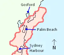 The storm cell formed at 4:25 pm AEST to the north of Nowra, roughly 115 km (71 mi) south-southwest of Sydney. After forming, it initially headed towards the coast in a northeasterly direction. The cell passed just to the west of Kiama at around 5:15 pm and gained a 'severe' classification from the Bureau of Meteorology at the same time.[15] 'Severe' is a classification used by the Bureau of Meteorology for thunderstorms which meet a specific criteria, namely producing hailstones with a diameter of 2 cm (0.8 in) or more, wind gusts of 90 km/h (56 mph) or greater and flash flooding, or tornadoes. This classification is also used by the Bureau to classify the attributes of a storm at any given time during its life.[7][16]