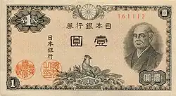 Notes from the "A series" (A号券) were the last denomination of "one yen" to be issued as paper currency in Japan. When World War II ended the amount of banknotes issued compared to before the war had more than tripled. This was due to factors such as wartime compensation, payment of retirement allowances to veterans, and refunds due to forced deposits and savings made during the war.[61] All of these things had a negative effect on the Japanese economy due to rampant inflation and the devaluation of the yen. In order to control the situation a process known as new yen switching (新円切替) was implemented by the Shidehara Cabinet.[58] The "A series" acted as renewal currency when banknotes were issued in denominations of 1, 5, 10, and 100 yen throughout 1946 (21st year of Shōwa).[62] One yen notes are also referred to as "Ninomiya 1-yen banknotes" (買取価格が高い二宮1円) as the obverse features agricultural leader Ninomiya Sontoku. The reverse side meanwhile uses a colored pattern ripple design with "1 Yen" written in English. This design had to be approved by the Supreme Commander for the Allied Powers (GHQ) before it was implemented for use.[61] These notes were issued both by the Bank of Japan and the Japanese government in name only, as production and printing was outsourced to the private sector.[63][64]