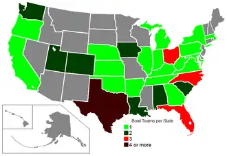 ![]() Number of bowl games per state. | |||||||||||||||||||||||||||||||||||||||||||||||||||||