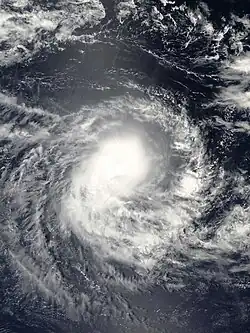In late August, a weak low-level circulation persisted near Diego Garcia. It was associated with a trough near the equator, and initially remained disorganized due to high wind shear. The disturbance was located at a low latitude near the equator, and a ridge extending from the eastern coast of Africa imparted a general west-south-west movement.[8] The system was organized enough to be classified by MFR on September 5 at 3.1° S.[9] Subsequently, the system developed more convection as its circulation became better defined. Operationally, MFR began issuing warnings on September 5 on Tropical Disturbance 01, and the next day upgraded it to a tropical depression.[8] Post analysis from MFR indicated that the system reached peak winds of 65 km/h (40 mph) on September 6,[9] the same day that the Joint Typhoon Warning Center (JTWC) initiated advisories on it as Tropical Cyclone 01S. The storm developed banding features, but the thunderstorms were sheared away from the circulation. On September 7, the storm moved through Seychelles—an island nation in the southern Indian Ocean—before weakening. MFR discontinued advisories on September 8, and the JTWC followed suit the next day.[8]