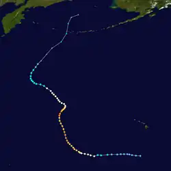 Around when it reached peak intensity, Fausto encountered an area of cooler water temperatures.[56] The hurricane quickly weakened, degrading to a tropical storm on August 26, by which time the convection had diminished.[57] On the next day, Fausto crossed 140˚W and entered the central Pacific. The CPHC downgraded Fausto to a remnant low on August 28 while the system was located over 800 mi (1,300 km) north of Hilo, Hawaii on August 28 at 1200 UTC. The remnants turned more to the west, toward an area of warmer waters and a tropical upper tropospheric trough. The interaction caused thunderstorms to reform, and Fausto regenerated into a tropical depression on August 30 about 635 mi (1,022 km) north of Oahu. On September 1, Fausto briefly reintensified into a tropical storm as it curved northward, steered by an approaching trough. On September 3, the front absorbed Fausto, and soon after the system moved across the Aleutian Islands of Alaska.[58]