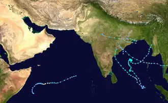 There were seven depressions throughout the season, of which three attained cyclonic storm status. One of the cyclonic storms formed before the start of the monsoon season, two depressions formed during the monsoon season from June to September, and the remaining systems formed after September.[1] The number of depressions was similar or greater than that of the previous three years.[2] However, the total of 3 cyclonic storms was below the average of 5.4.[3]