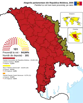 Parliamentary elections were held in Moldova on 6 March 2005.[1] The result was a victory for the Party of Communists of the Republic of Moldova (PCRM), which won 56 of the 101 seats.[2]