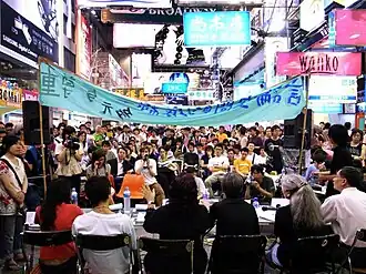 The second forum was held on the evening of May 12 in Sai Yeung Choi Street, Mong Kok, titled "The Bottom Line of Speech Space - Diversity and Respect." About 300 people from both sides, including scholars and citizens, attended the forum.[38] The invited Teachers' Association and Mingguang Society again refused to attend.[5][39]