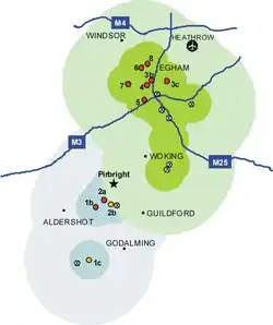 The Institute of Animal Health at Pirbright carried out research into foot-and-mouth disease as well as other diseases affecting livestock.[13] The Merial Animal Health site was also identified as a possible source of the infection, as they were one of four European laboratories authorised to handle the strain to produce vaccines. The next closest laboratory working with the strain was in Belgium.[14][15][16] As a result of the location of the two Pirbright laboratory sites, the isolation zone was extended.[17]