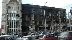 ![]() An opposition-captured vehicle burns near the capitol building during citywide protests and riots in Bishkek, Kyrgyzstan on 7 April 2010. Guards can be seen to the left of the smoke. | |||