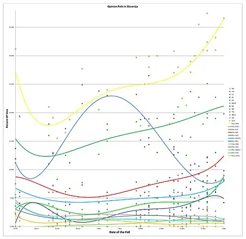 Mladina[39] November 28 32.4% 25.1% 6.0% 12.1% 6.6% 5.3% 5.2% 1.5% 1.5% 1.4% 1.5% - 0.2% - - - - -