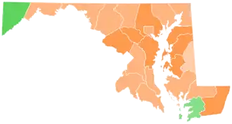 Maryland is one of six states where Obama performed better in 2012 than in 2008, with his percentage of the vote increasing from 61.92% to 61.97%. He flipped Somerset County but lost Kent County which he won in 2008 . In this election, Maryland voted 22.21% to the left of the nation at-large.[ 2]
