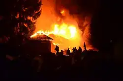 In Lviv, police and SBU defected to the side of the Euromaidan protesters and the new regional authorities (People's Rada).[178] At 6:30pm, an explosion occurred somewhere at the Berkut barracks, and the building caught fire (the cause of which was not officially determined). Reporters saw masked individuals fleeing the scene.[179] 2 Berkut died in the fire.[80] Lviv banned wearing masks and balaclavas in public places.[180]