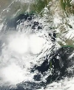 A low-pressure area formed over the Bay of Bengal on May 19. It slowly consolidated, prompting IMD to classify it as a Depression on May 21, followed by JTWC issuing a Tropical Cyclone Formation Alert (TCFA) in the following hours.[4][5] Over the following day, the depression continued moving north-northeastwards towards an area of high vertical wind shear. The JTWC cancelled the TCFA issued for the system, stating that high wind shear had caused the convection to start dissipating.[6] The storm continued losing convection, until it weakened into a well-marked low-pressure area on May 23.[7] The remnant system persisted for several more days, moving over the Indian state of Odisha late on May 25, before dissipating on the following day.[8]