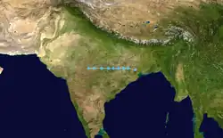 During June 19, an eastward propagation of the Madden–Julian oscillation over the maritime continent, lead to the season's first area of low pressure developing over coastal parts of Bangladesh.[2] This helped the monsoon set in over India's north-eastern states and advance in to central India.[2] During the final week of June the monsoon weakened, which led to the emergence of heatwave conditions over eastern parts of coastal India.[2] The monsoon subsequently started to revive as it interacted with the mid-latitude westerlies and it advanced into parts of the Himalayas and northwest India by July 1.[2] During the first week of July an area of low pressure and several upper air cyclonic circulations caused the monsoon to advance further, where it covered the whole of Haryana, Madhya Pradesh, Punjab and Uttar Pradesh by July 7.[2] Over the next two weeks a trough of low pressure and a cyclonic circulation, helped advance the monsoon into remaining parts of the Arabian Sea, central and north-western India.[2] The India Meteorological Department (IMD) subsequently declared that the monsoon covered the whole of India on July 17, which was about two days later that normal.[2]
