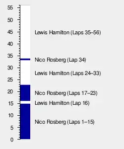 On the seventh lap, the stewards placed Vergne, Maldonado, Button and Gutiérrez under investigation for speeding behind the safety car.[41][43] The Mercedes duo ran close behind each other with Hamilton remaining behind to conserve fuel, and observe the comparison between himself and Rosberg. The tight confines of the second half of the lap gave Hamilton difficulty entering the DRS activation zone before turn 11 and his left-front brake was 100 °C (212 °F) cooler because the safety car was slower. He braked heavily at certain corners to prevent glazing.[40] Grosjean steered right to try and pass Vergne for ninth on the tenth lap but the latter blocked him.[41][42] It was announced on the following lap no further action would be taken against Button although Vergne, Gutiérrez and Maldonado were imposed five-second stop-and-go penalties to be taken at their next pit stops.[41] Ricciardo ran close behind Bottas but was not fast enough to pass.[40]