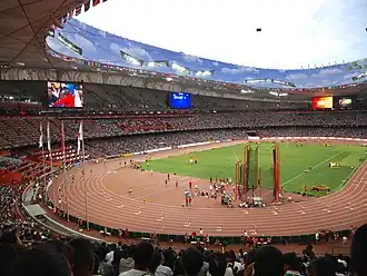 The event was primarily held at the Beijing National Stadium, which served as the athletics venue during the 2008 Summer Olympics. Weather concerns prompted a reduction in capacity for the World Championships in Athletics; only the lower and middle tiers of the stadium were open, capping the venue at around 54,000 spectators rather than its capacity of 80,000.[10] Tickets for the championships were available in three price categories, ranging from 50 RMB to 500 RMB.[11]