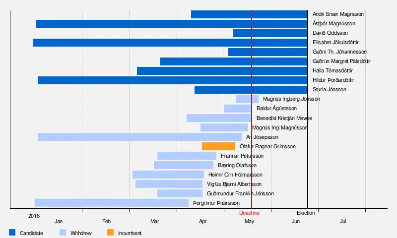 - Ólafur Ragnar Grímsson – Incumbent President. In January, he declared that he would not seek reelection,[6] but decided to enter the race on 18 April after political unrest in connection with the Panama Papers leak.[8] He subsequently withdrew on 9 May stating as his reason that other qualified candidates had now entered the race.[49]
