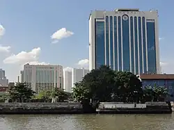 Makati City Hall (taller building to the right) as viewed from the Pasig River; the allegedly overpriced annex is the building to the left.