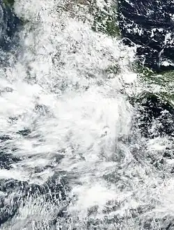 A low-pressure trough began producing disorganized convection over the waters of the Pacific Ocean, well to the south of Baja California Peninsula, on July 14.[54] Despite only marginally conducive environmental conditions, the disturbance began to show signs of organization two days later,[55] and it attained tropical depression status by 06:00 UTC on July 17.[56] Strong west-northwesterly wind shear confined the storm's intermittent bursts of convection well to the southwest of its low-level circulation, and the depression consequently failed to produce winds above 35 mph (55 km/h).[57] The system's center later degenerated into a low-pressure trough within the Intertropical Convergence Zone, prompting the NHC to discontinue advisories at 21:00 UTC on July 20.[58]