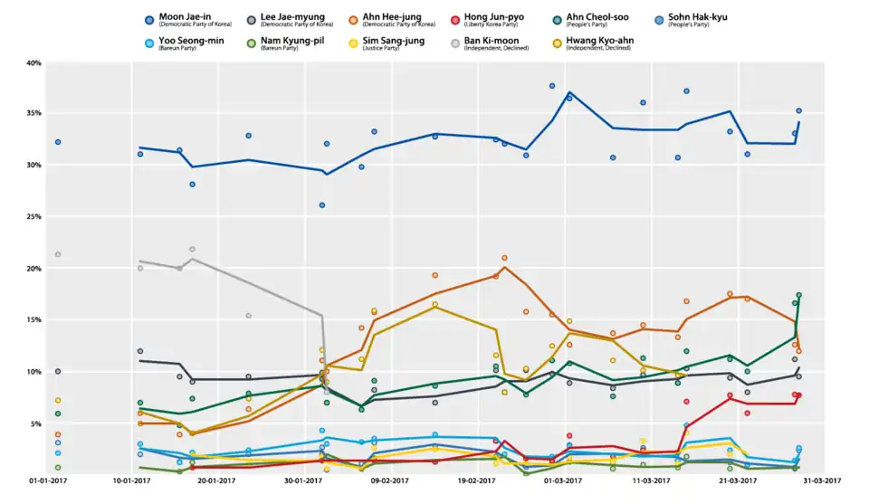 Opinion polling before April consistently placed the Democratic Party's candidate, Moon Jae-in, runner-up in the 2012 election, as the front-runner. Second place in the opinion polls was initially held by former UN Secretary-General Ban Ki-moon, who declined to run in February, followed by Ahn Hee-jung, whilst he lost the Democratic primaries to Moon. Support for People Party founder Ahn Cheol-soo then surged, threatening Moon's lead in the polls throughout early April, before descending to approximately equal that of Liberty Korea Party's candidate, Hong Jun-pyo, in final polls.