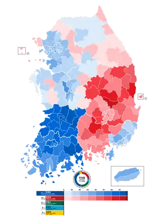| South Jeolla | 737,921 | 59.9 | 30,221 | 2.5 | 378,179 | 30.7 | 25,819 | 2.1 | 49,509 | 4.0 |