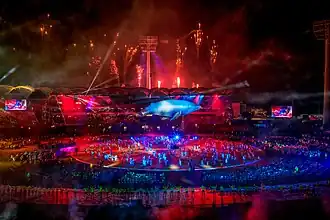 Carrara Stadium, located in the suburb of Carrara, was the main venue for Athletics, the Opening ceremony and the Closing ceremony. The seating capacity of the stadium was temporarily increased to 40,000 for the games by the installation of a large temporary North Stand.[30] The new Carrara Sports and Leisure Centre hosted the Badminton, Para Powerlifting, Weightlifting and Wrestling events.[31] The Carrara Indoor Sports Stadium hosted the back-of-house event operations.