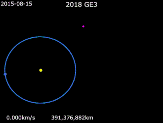 ![]() The orbit of 2018 GE3 with 30-day markers | |