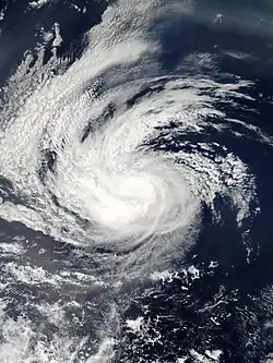 A tropical wave emerged off the west coast of Africa on June 20 and crossed into the East Pacific on July 3, where it interacted with the monsoon trough and began to organize. This system developed a defined surface low on July 6 and was classified as a tropical depression about 435 mi (700 km) south of Acapulco, Guerrero. Steered along a northwest trajectory by a mid-level ridge, the depression traversed a region of favorable conditions which enabled slow intensification.[28] Initial predictions from the NHC suggested significant strengthening of the cyclone.[29] However, Cristina instead encountered cooler waters and eventually drier air; it reached its peak intensity late on July 10 with winds of 70 mph (110 km/h) as it passed west of Socorro Island. Thereafter, the cyclone turned west along the south side of the subtropical ridge and steady weakened. The storm degraded into a remnant low around 18:00 UTC on July 12 and degenerated into a trough on July 15 about halfway between Hawaii and Baja California Sur.[28]