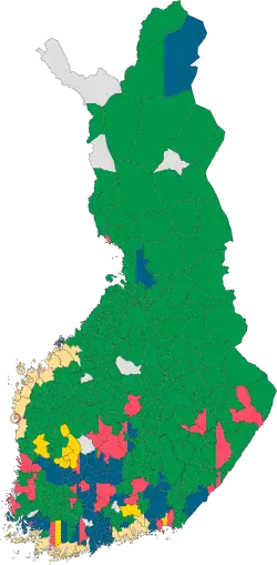 Most parties, such as the Social Democratic Party, Centre Party, Green League, and the Left Alliance showed a decline in their vote share and council seats. The National Coalition Party had a small increase, while the biggest winner was the Finns Party, who saw a major increase in vote share and council seats. The 14.5% they received is the highest vote share in municipal elections since the party's foundation. The party is now the largest group on at least six councils: in Hamina, Orimattila, Kihniö, Ylöjärvi, Kankaanpää and Hämeenkyrö.[5]