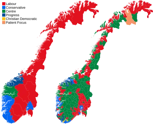 The election was won by a coalition consisting of the social-democratic Labour Party and the agrarian Centre Party that entered into negotiations to form a government.[3][4] The election also resulted in a majority for the parties that seek to dissolve the unpopular and controversial Viken county.[5] Jonas Gahr Støre's Labour Party retained its position as Norway's largest party and expanded their lead in seats over the Conservatives, despite a slight drop in its share of votes and the loss of one seat.[2] Incumbent Conservative Party prime minister Erna Solberg conceded defeat.[6] Her party ended up with the second-largest number of representatives. Støre aimed to form a majority government with the Centre Party and the Socialist Left Party,[7][8] but the latter stated they would remain in opposition, citing disagreements over climate and welfare policies,[9] while remaining open to future negotiations and supporting the government on common ground.[10] On 14 October, Støre became prime minister of a minority government, the Støre Cabinet.[11][12]