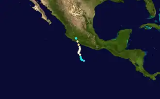 A broad cyclonic gyre over Central America, spawned from the interaction of the monsoon trough and a tropical wave, led to the formation of an area of low pressure south of Mexico on June 16. The low gradually organized and became a tropical depression around 18:00 UTC on June 17 while located about 195 mi (315 km) south-southwest of Acapulco. The depression became Tropical Storm Dolores within six hours. Ridging over Mexico shifted east as Dolores developed, causing the cyclone to curve to the north-northwest. A favorable environment facilitated its development, and the storm reached peak winds of 70 mph (110 km/h) as it made landfall near San Juan de Alima, Michoacán, around 15:00 UTC on June 19. It harbored a well-defined eyewall at the time, and it is possible that Dolores temporarily surpassed tropical storm intensity. Once inland, though, the system quickly weakened over the high terrain of southwestern Mexico, dissipating around 06:00 UTC on June 20.[26]