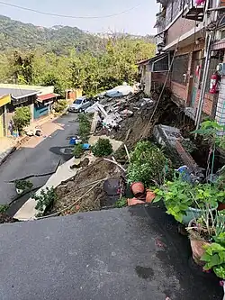 A total of 779 landslides were recorded following the earthquake, affecting 433.93 hectares.[54] A massive landslide occurred near Xiulin.[92] The Suhua Highway was closed after sections of it were struck by at least nine rockfalls. Rockfalls occurred on another highway which hit at least 12 cars and injured nine people.[93] A landslide along Provincial Highway 9 between Su'ao and Hualien blocked traffic at Chongde railway station, while a rockfall also occurred in the Heren-Chongde section of the Eastern Trunk line in Hualien.[88] A section of the Central Cross-Island Highway between Dayuling and Taroko was also closed.[64] Two German nationals were reported to have been trapped in a tunnel in Hualien.[30] In Taichung, rockfalls blocked a road, damaging three cars and injuring a driver.[94] A portion of Guishan Island collapsed into the sea.[95]