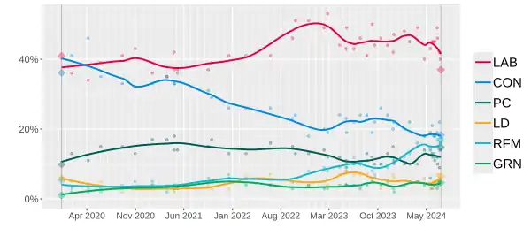 | 17–18 Jun 2023 | Redfield & Wilton | N/A | 1,000 | 43% | 22% | 10% | 7% | 12% | 4% | 1% | 21 |