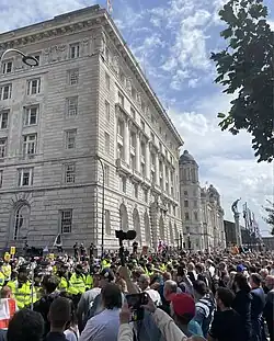 In Liverpool, two groups who had been taking part in separate protests joined up at the Pier Head before moving on to The Strand and Church Street.[98] Many shops were damaged and looted as Spellow Library, a community hub in Walton was torched and wheelie bins set alight. A police officer was assaulted after being pushed off his motorbike and another hit in the head by a chair as protesters threw bottles, bricks and a flare at officers. 23 people were arrested in relation to the disorder as two police officers were hospitalised with a broken jaw and broken nose respectively.[92]